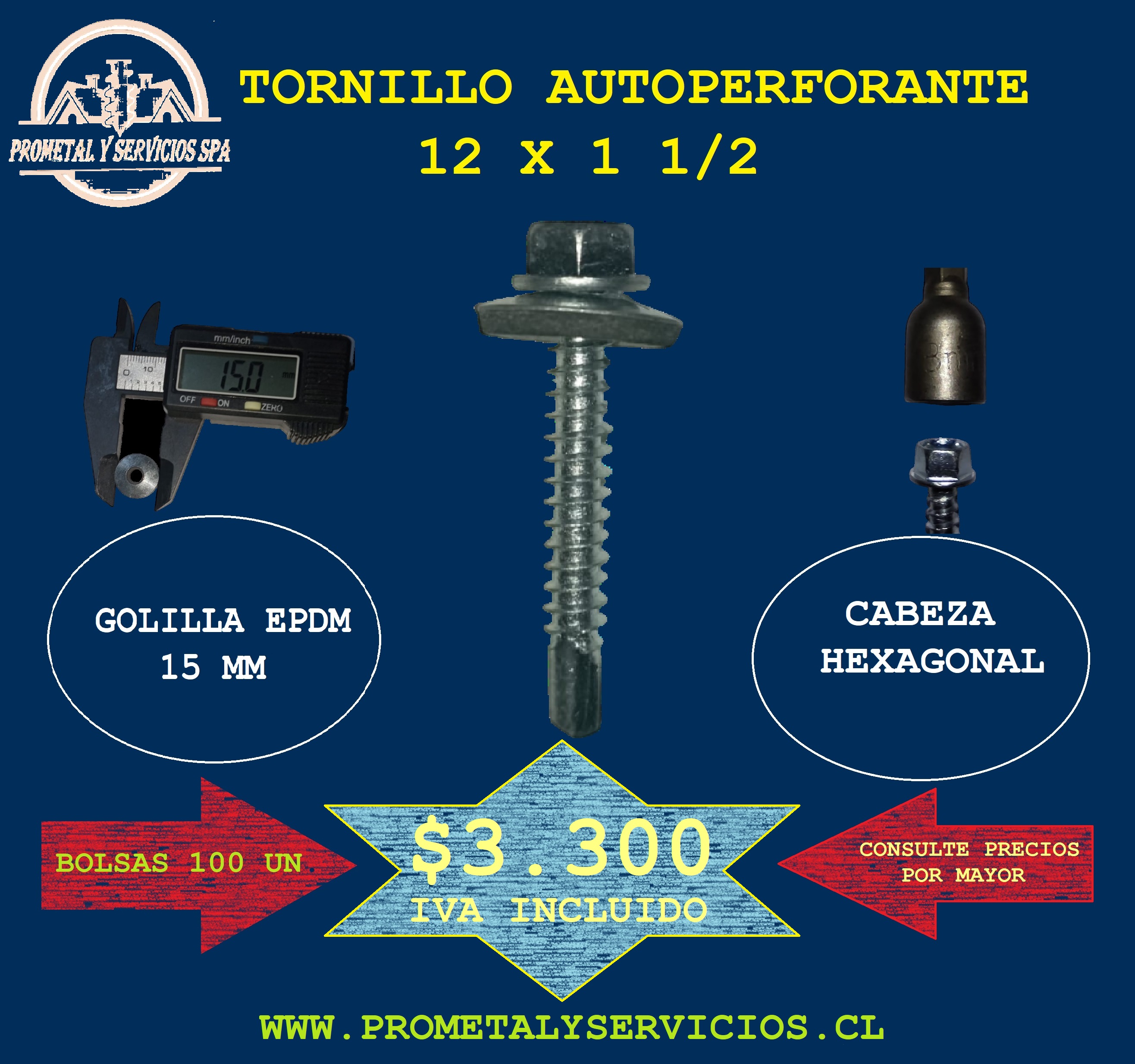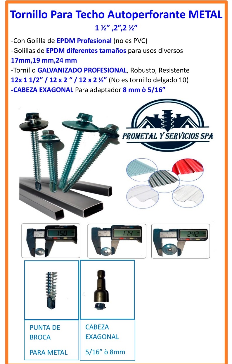 Tornillo 12x 1 1/2" / 12 x 2 " / 12 x 2 1/2" , de cabeza hexagonal ,con golilla EPDM diferentes tamaños , para usos 17mm, diversos 19mm , 24 mm , Galvanizado, Robusto, Resistente.