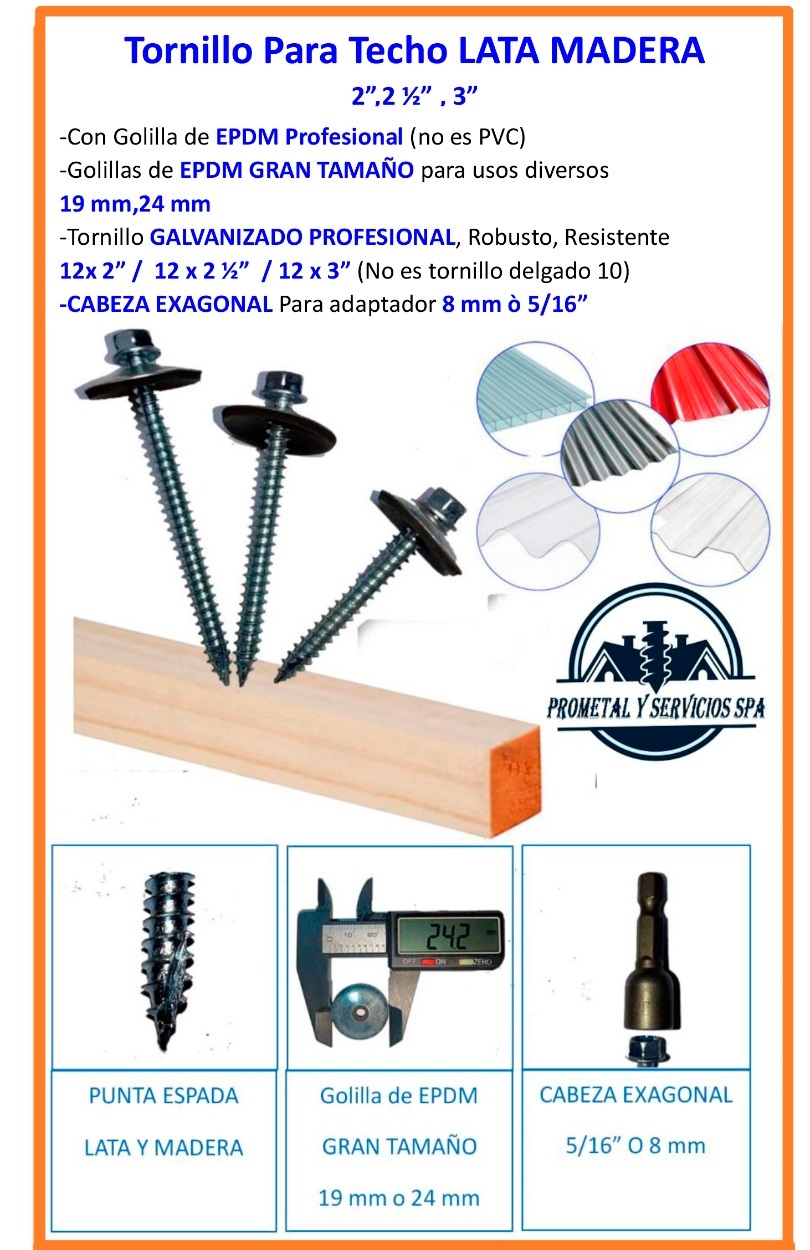 Tornillo para techo lata madera 12x 2" / 12x 2 1/2" / 12x 3" , de cabeza hexagonal ,con golilla EPDM ( no s PVC)gran tamaño , para usos diversos 19mm , 24 mm , Galvanizado , resistente.